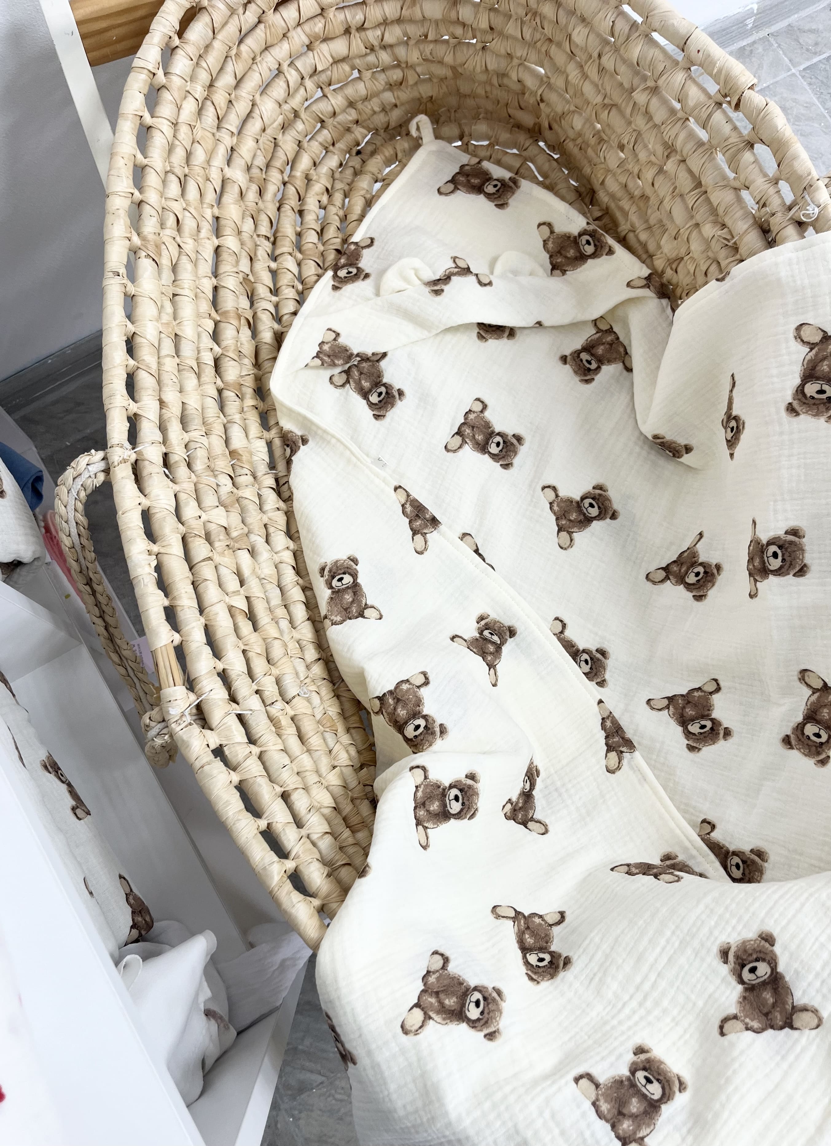 с уголком. Большой размер 100х100 см, можно использовать до 5 лет малыша. Сшито из 4 слоев муслина. Хорошо впитывает влагу. Легко стирать, не нужно гладить. В путешествие незаменимая вещь, так как занимает минимум места. Быстро сохнет.